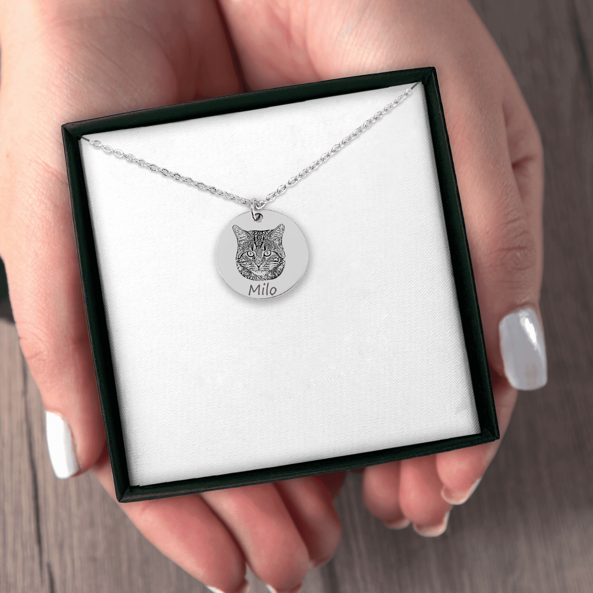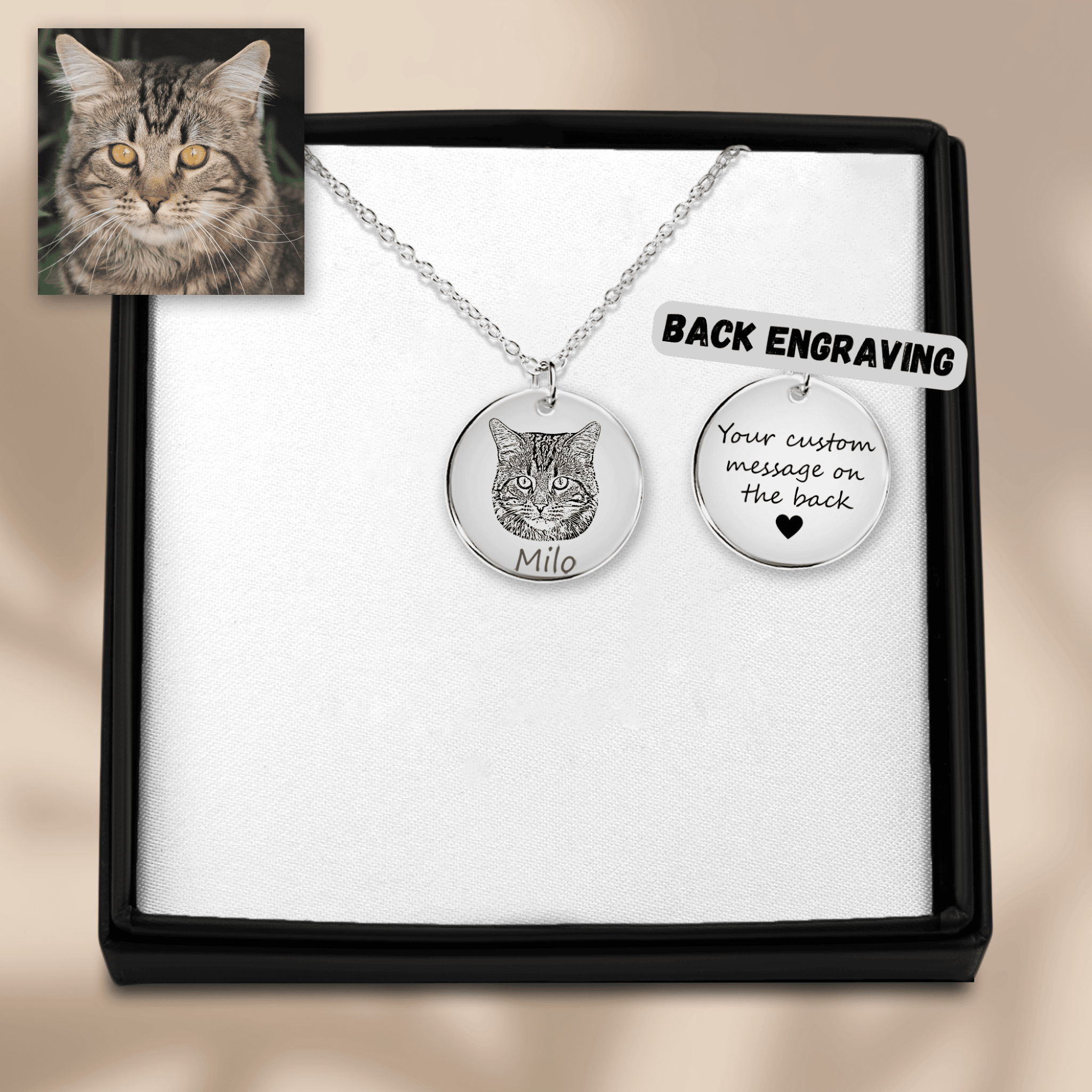 More than just a necklace… to our best friends, the small, the big, the furry, the shorthaired & the bald…the ones that bring joy to our lives. Honor them and always keep them by your side with this personalized necklace. Personalize it with the picture of your cat and its name and keep them close to your heart forever. Optionally, you can choose to give the necklace an even more personal touch by adding a custom message on the back.